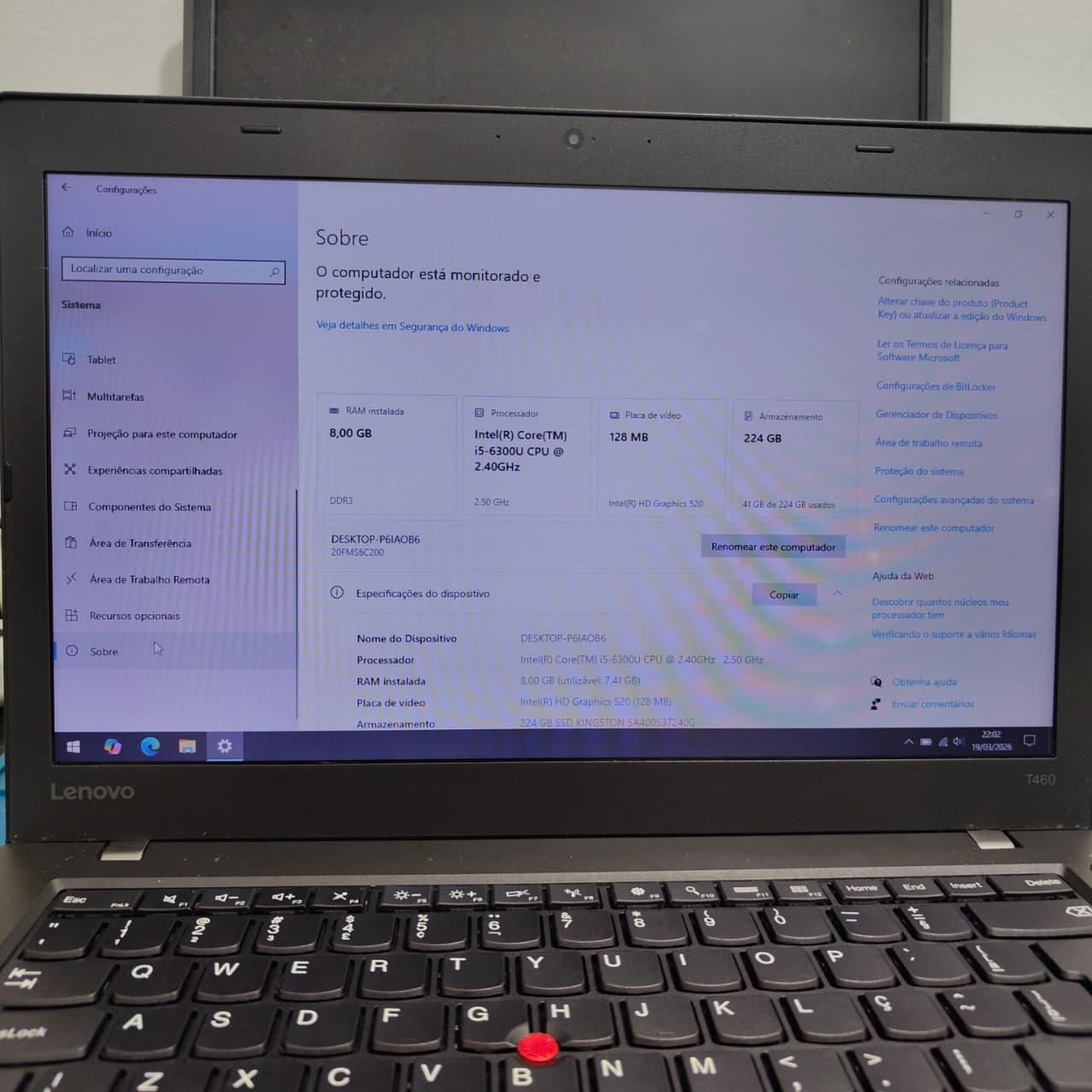 O Lenovo ThinkPad T460 com processador Intel Core i5 de 6ª geração, 8GB de RAM e SSD de 240GB é um notebook corporativo seminovo focado em durabilidade e produtividade para tarefas de escritório e estudos.